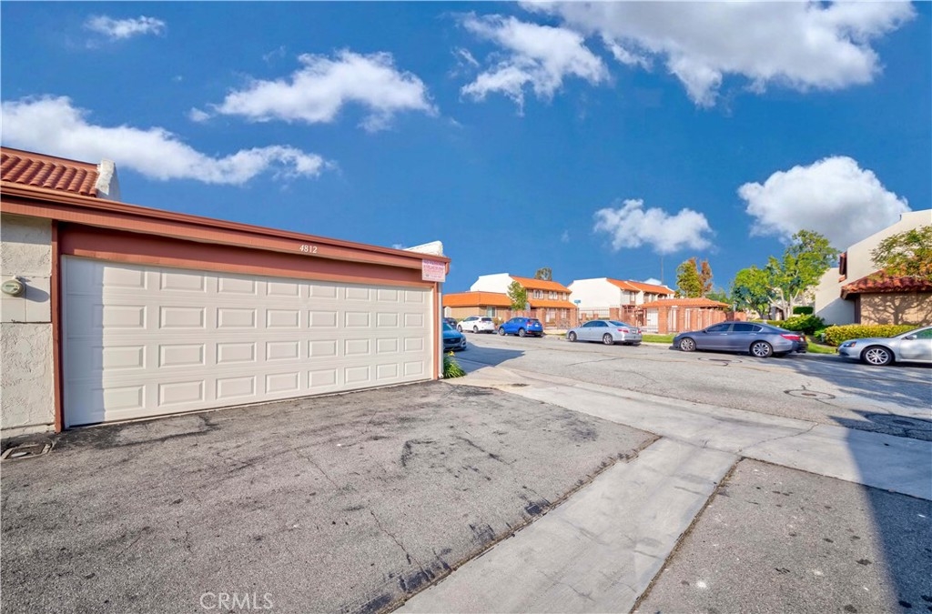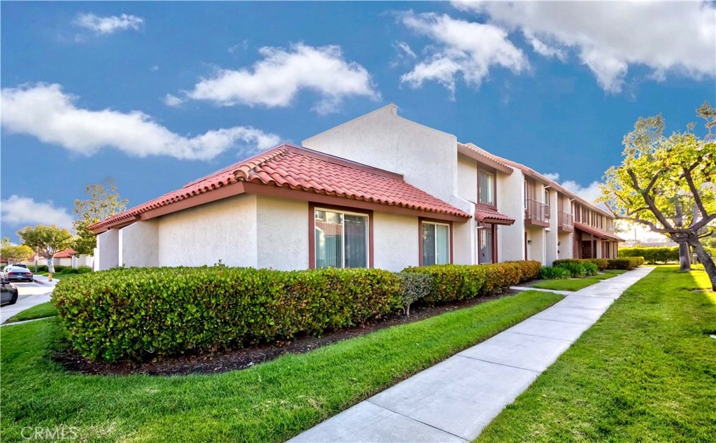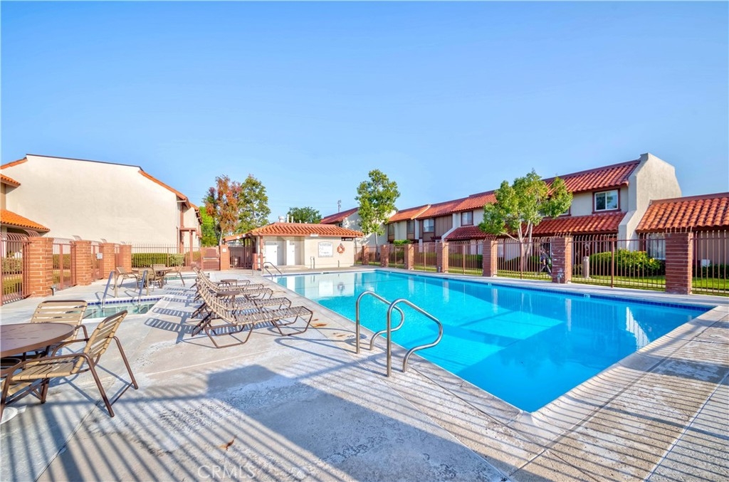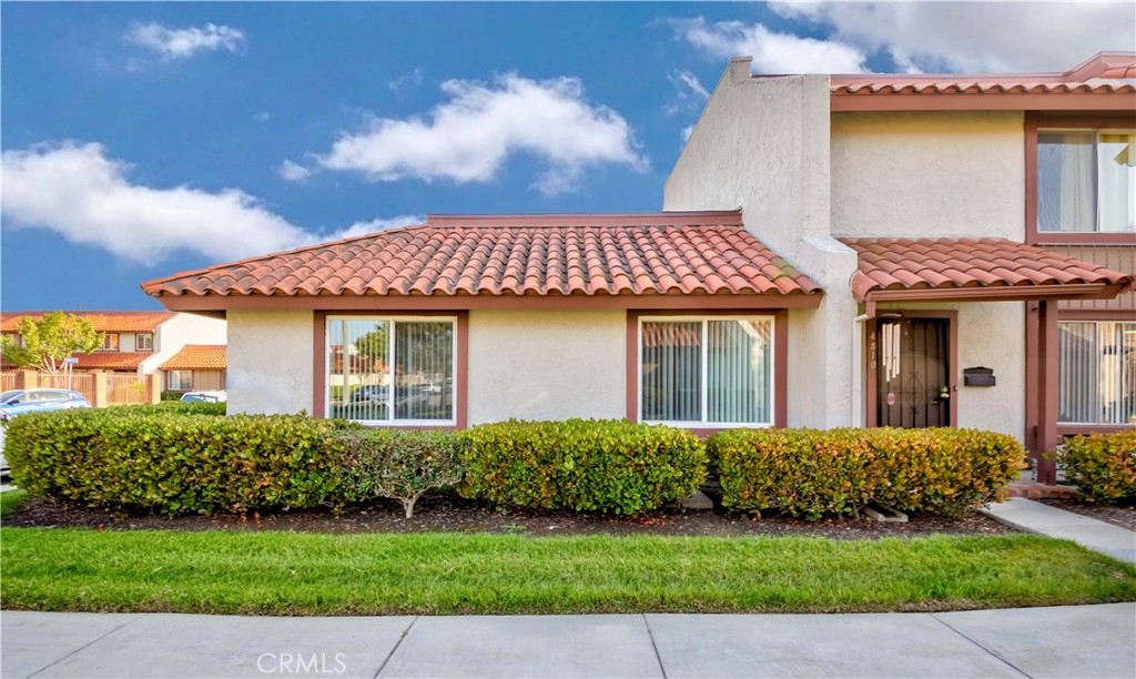Highly desired one-story end unit in the community of Casitas California, Buena Park. This property features private living one adjoining wall provides privacy, resembling a standalone house, with a charming cement pavers patio leading to a two-car enclosed garage with laundry facilities, cabinets, and shelving. Parking for guests is conveniently available curbside at the front door. Recently remodeled kitchen with white cabinets, quartz countertops, and vinyl windows. Neutral tile flooring throughout, with faux wood flooring in two bedrooms. Newer central air & heating unit installed in the hallway. The bathroom features a large tiled shower with enclosure and a vanity with a granite countertop. The property also includes a solid wood shelving unit in the living room. Sunny Hills High School, Enjoy access to two community pools, a clubhouse, and gated RV parking. Convenient location: Situated away from Beach Blvd, the unit is close to various amenities including restaurants, shopping centers.