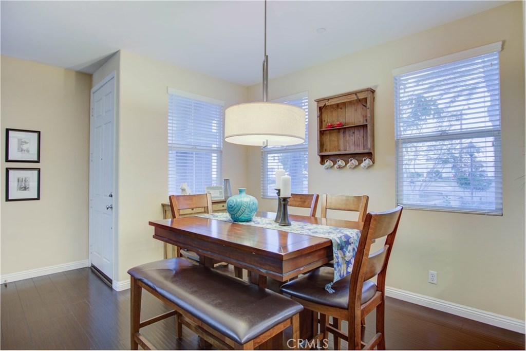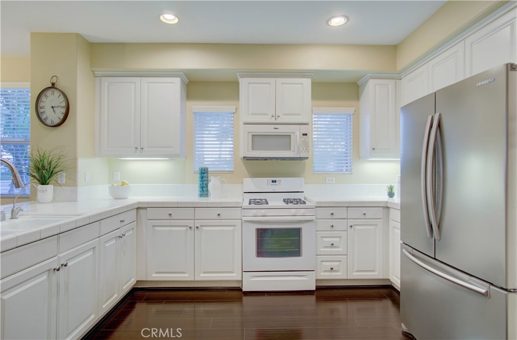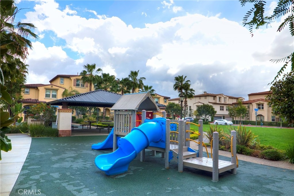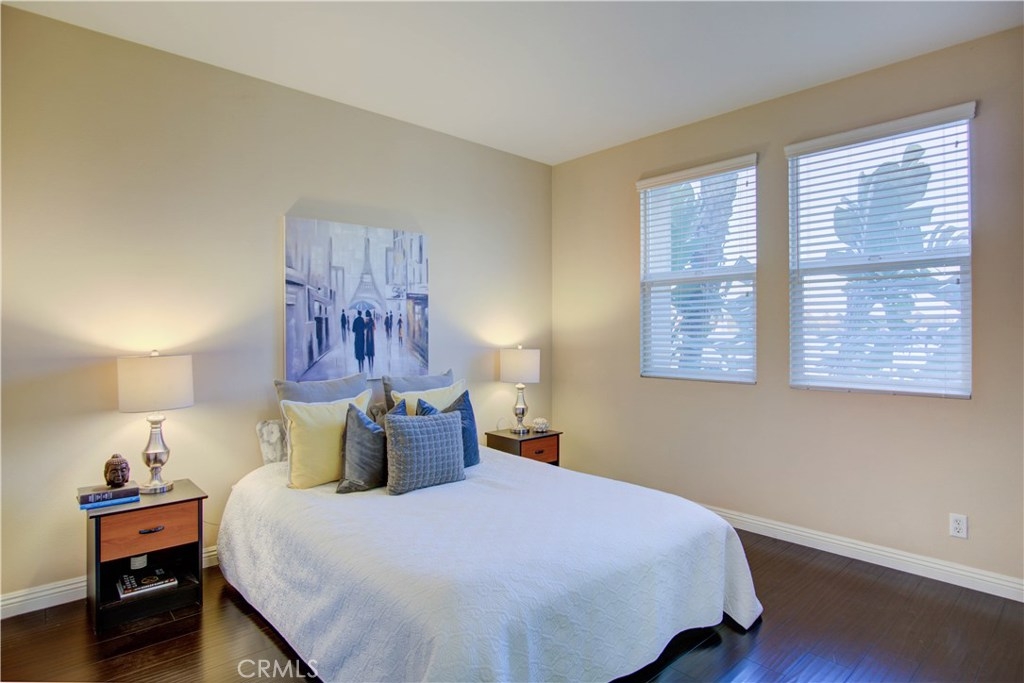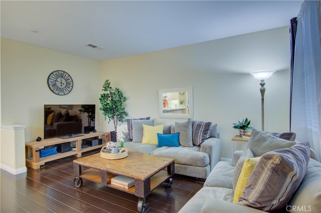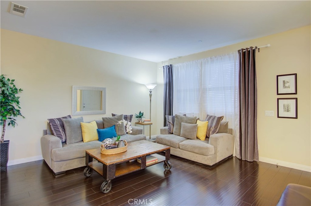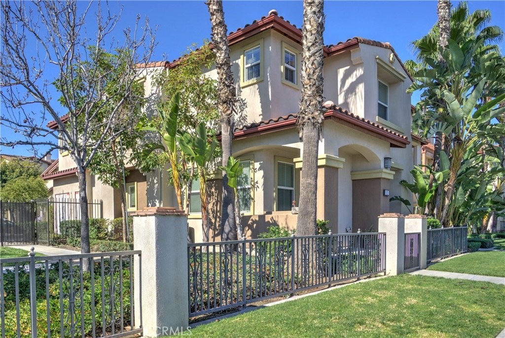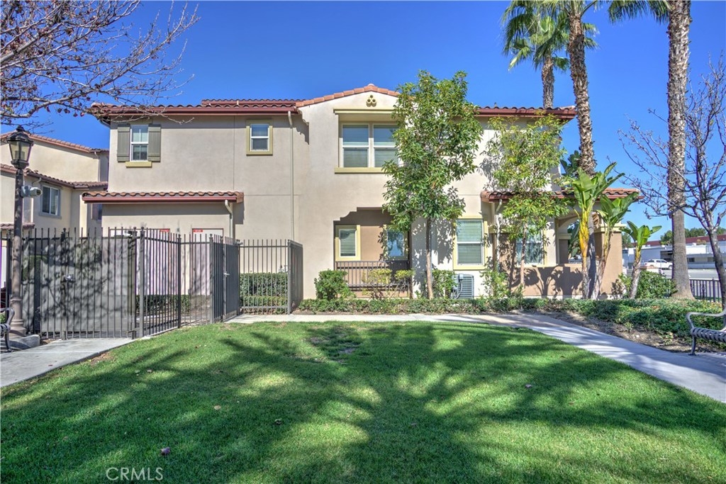 LOCATED NEXT TO A SMALL GREEN AREA WITH VIEW IN ALL SOUTH SIDE WINDOWS! One of the most convenient areas in a newer development in Buena Park. This property faces Dale Avenue. Picture perfect! Popular and desirable "Founder's Walk" newer private gated community. Quiet, relaxing ambiance and beautifully maintained by the Association. This awesome end-unit, attached only on one side, is a RARE 4-bedroom/2.5 bathroom model. This delightful two story home is warm, inviting and has a fantastic floorplan for great entertaining. Front porch creates a charming atmosphere. Host family and friends in both the upscale living and dining rooms. Lots of windows make it light, bright & airy. Open chef's kitchen with tile countertops, upgraded white color cabinets & white color appliances. Gorgeous dark color laminate flooring throughout. Powder room w/ white pedestal sink, large storage area. Sumptuous master suite w/ dual sinks, oval tub, separate shower & spacious walk-in closet. All 4 bedrooms are generous sized. Upgraded light fixtures, recessed lighting, custom painting. Handy upstairs laundry room. Direct access to the two car garage and plenty of guest parking nearby. Easily accessible and within walking distance to Metrolink -- just follow the community's exclusive gate to the Metrolink station. Enjoy Association pool, spa & lounge area. The "Beach Blvd Corridor" is close by with all its restaurants, grocery markets, parks, transportation, freeways and golf courses. IT SHOWS GREAT!