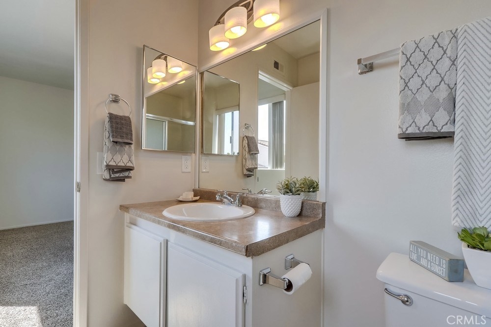 Looking for something with plenty of space? This spacious, light and bright multi-level home is what you have been looking for!. The home has recently been painted throughout and adorned with new light fixtures and ceiling fan. Enjoy the private patio and expand your living space by opening the large sliding glass door in the living room. The dining area overlooks the large living room with a cozy fireplace. White cabinets with decorator pulls, on trend light fixture and a roomy breakfast nook highlight the kitchen. Large Master Suite features an oversized vanity area, 2 large closets with mirrored sliding doors and balcony overlooking the greenbelt where you can enjoy the neighborhood and city lights. Two more secondary bedrooms with one configured as a second smaller Master Suite with walk-in closet. The community has pool, pool showers, spa, sauna, clubhouse and exercise room. Conveniently located near shopping and Cypress College. This property is a single family residence/attached home so FHA and VA buyers are welcome!
