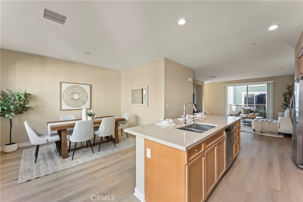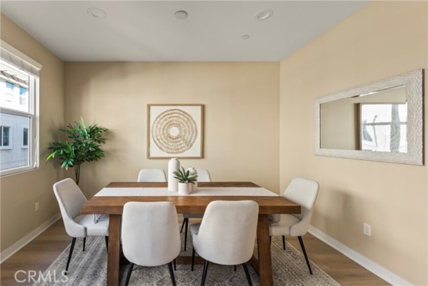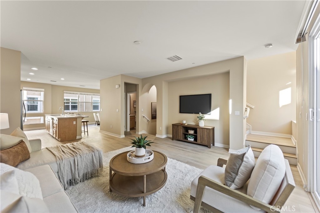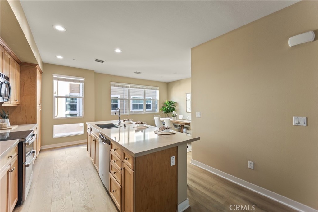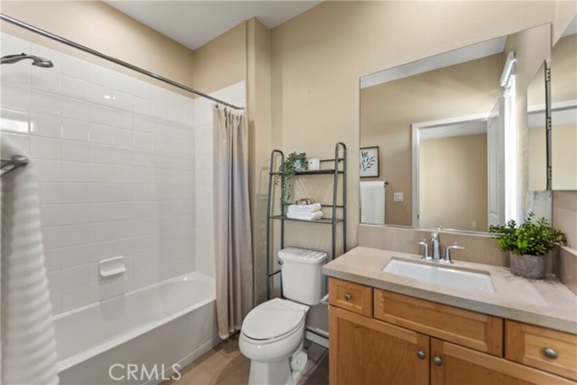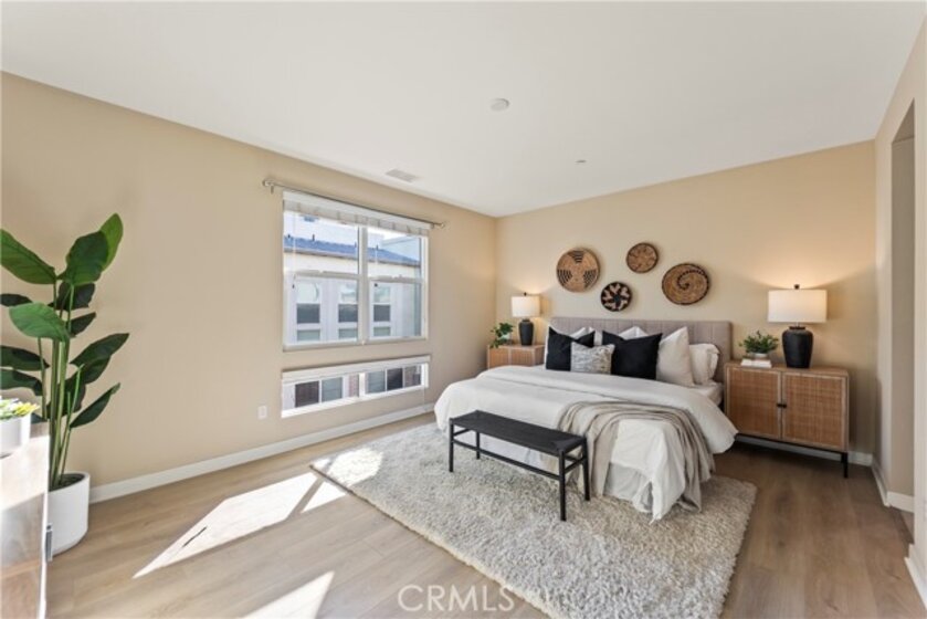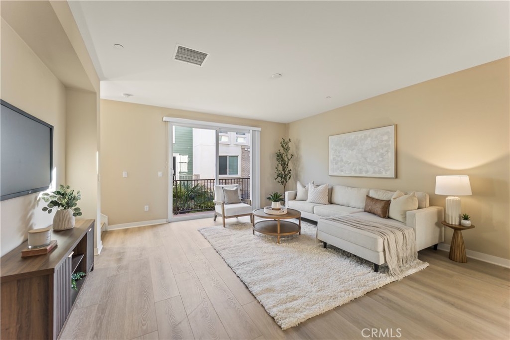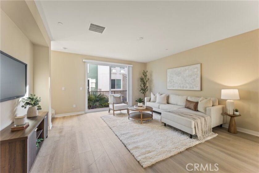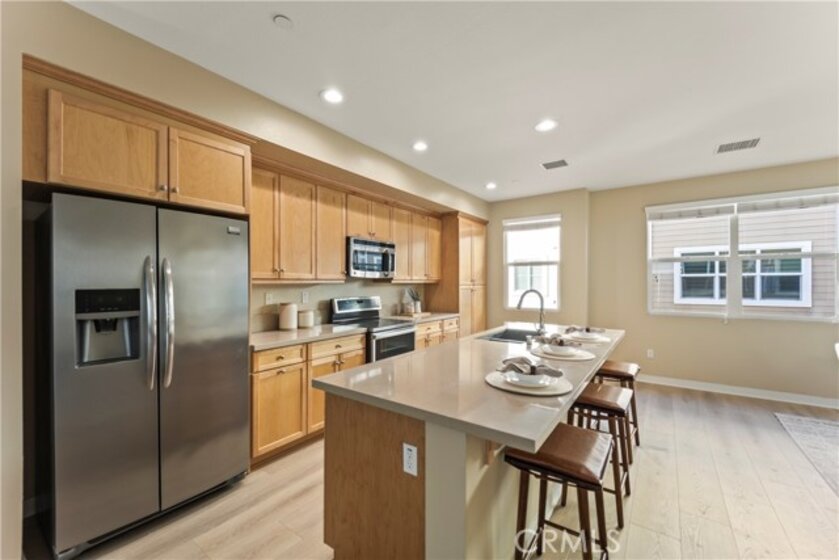 Paid-off solar on roof. No carpet throughout. No Mello-Roos tax. Newly installed waterproof, dent-resistant, pet-friendly wood flooring. Welcome to this modern attached condominium located in the Parker Collection community of Buena Park. Built in 2015 by City Ventures, this California Title 24–compliant home offers 2 bedrooms plus a den, 2.5 bathrooms, and approximately 1,721 square feet of thoughtfully designed living space across three levels. The first floor includes one bedroom and access to the attached side-by-side two-car garage, which is pre-wired for an electric vehicle charger and offers additional storage space. The second level features the main living area with an open-concept kitchen, living room, and dining area, along with a powder room and a private balcony. The kitchen is appointed with Oasis-color quartz countertops on the counters and island, a 6-inch backsplash, Laguna maple natural wood cabinetry with soft-close drawers and doors, under-cabinet lighting, a 30-inch induction range, stainless steel energy-efficient appliances, and a stainless steel sink with a single-handle pullout faucet. Quartz countertops extend into the powder room and bathrooms. The third level includes two en-suite bedrooms, including the primary suite. The spacious primary bathroom features a walk-in shower, while the secondary bathroom includes a shower-over-tub configuration. All shower and tub walls are fully tiled. Framed mirrors are installed in the primary bathroom and powder room. Kohler fixtures are used in the kitchen and all bathrooms. Additional features include minimum 9-foot ceilings throughout, 2.5-inch casing, 4-inch baseboards, dual-glazed windows with ultraviolet coating for insulation, a Nest thermostat, and an energy-efficient heating and cooling system. The home is equipped with paid-off solar panels with a 25-year product warranty. Community amenities include a swimming pool, tot lot, outdoor BBQ area, and a private gated dog park. Conveniently located within walking distance to The Source and just blocks from Buena Park Downtown and Buena Park Mall, with easy access to the 91 and 5 freeways and proximity to Knott’s Berry Farm and Disneyland.