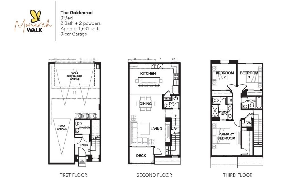 Monarch Walk is a unique gated neighborhood of 15 residences artfully designed with open floorplans, generous kitchens perfect for entertaining, oversized garages and connected and sustainable features. Enjoy an outdoor entertainment area with BBQ and shaded dining, community open park and pocket park. This Goldenrod floorplan features a spacious entry with powder bath, and a rare 3-car garage on the first level. When you get to the mid-level, you'll find a powder bath, and an incredibly open kitchen with oversized island. You also have a dining area, living room and deck on that main level. On the third floor you'll find your primary suite and two secondary bedrooms.