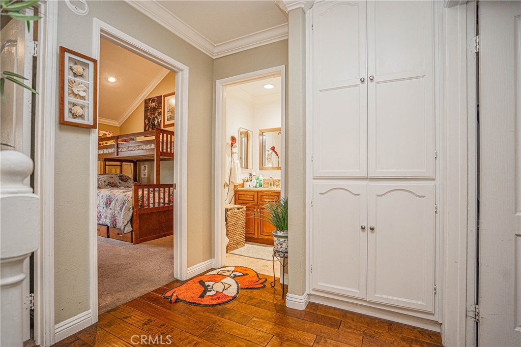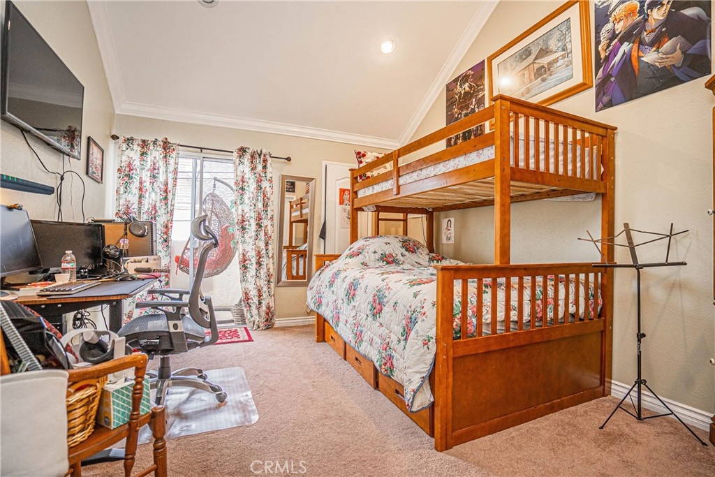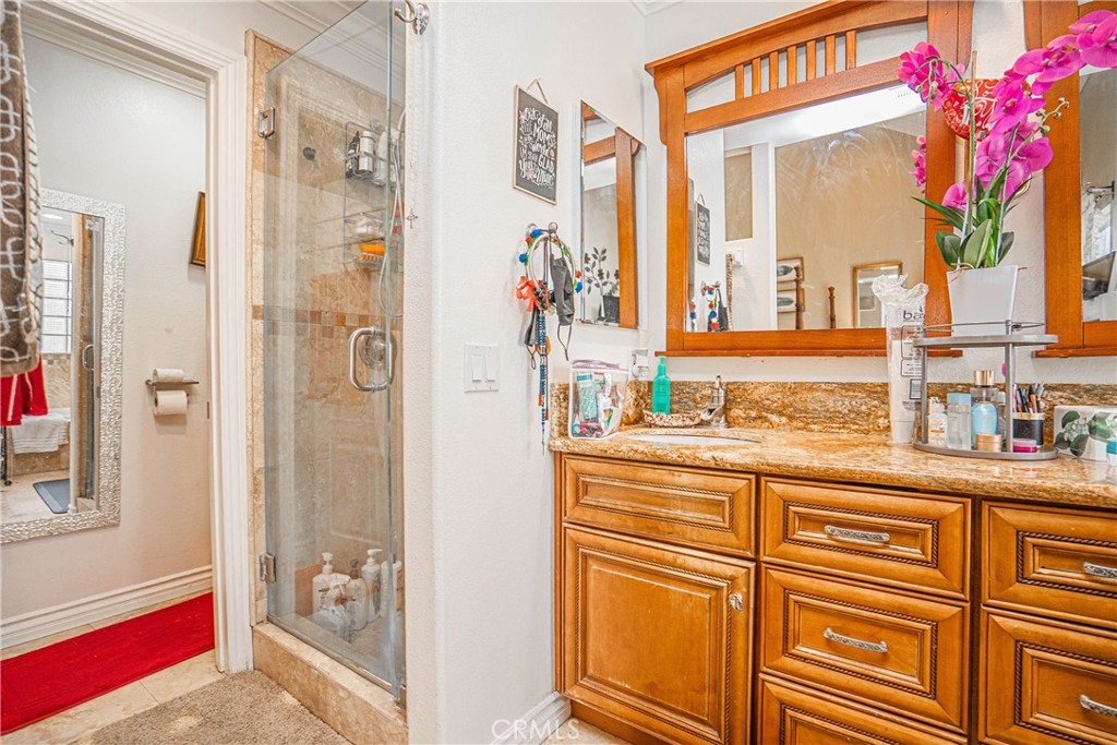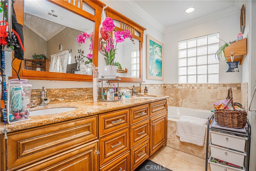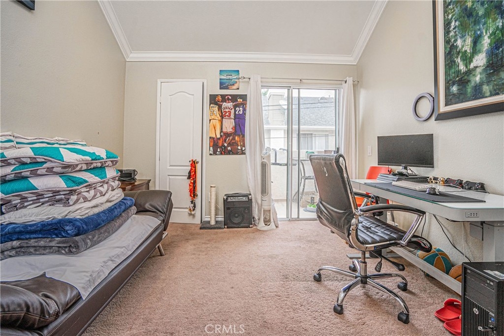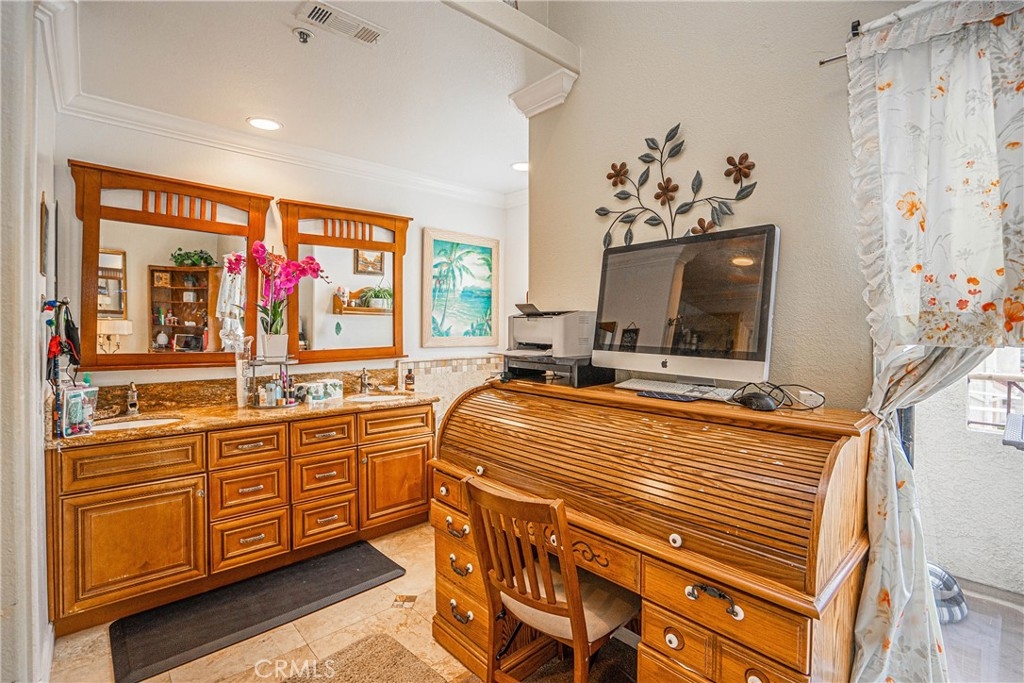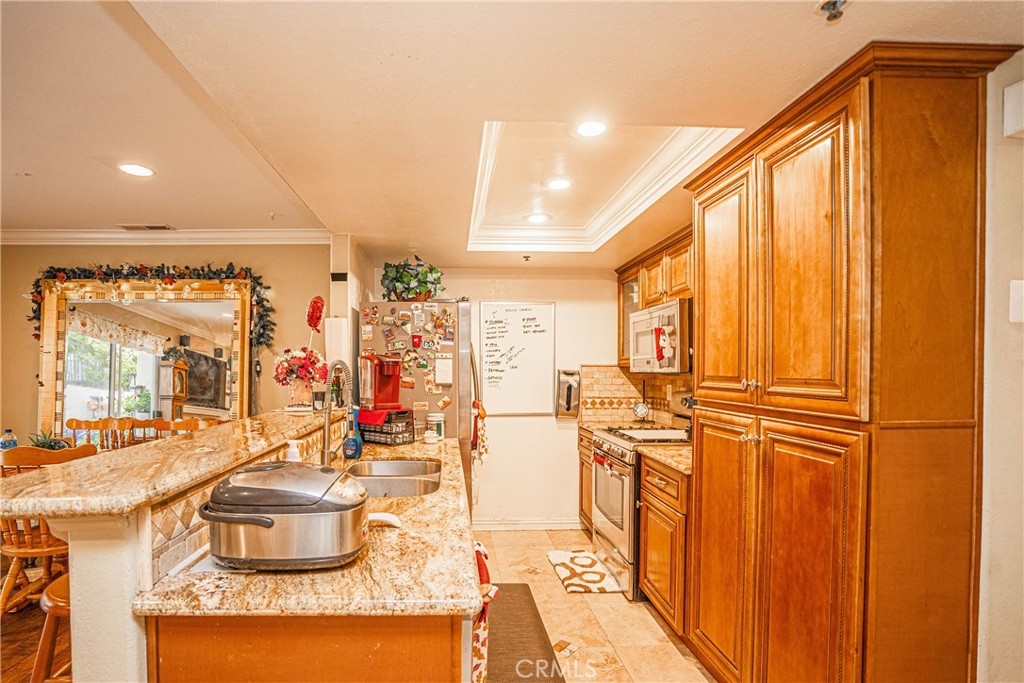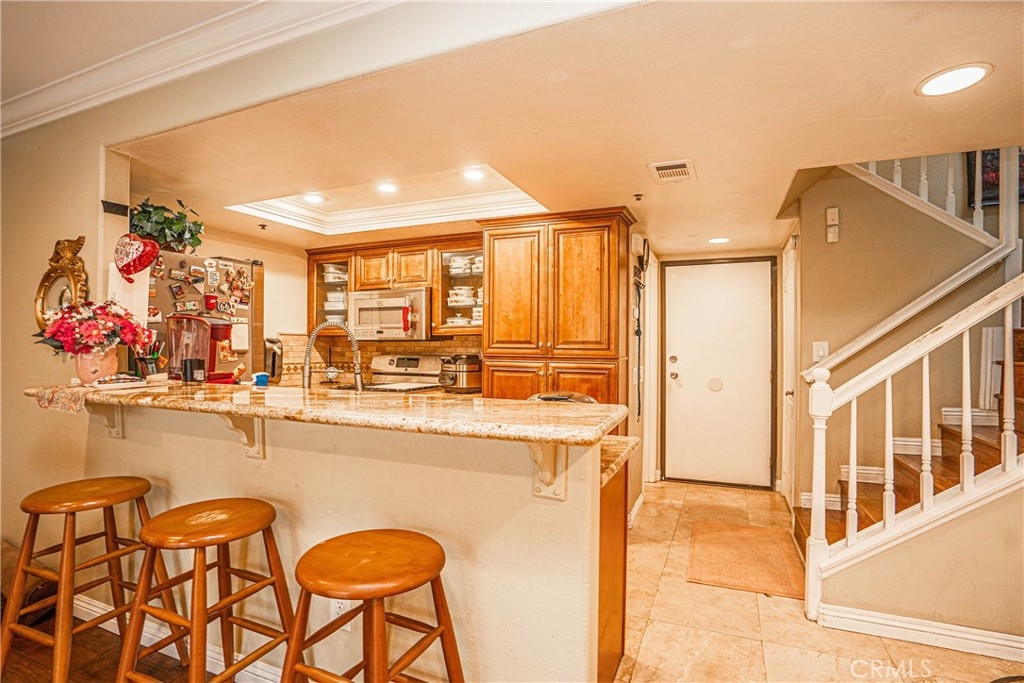 Gated community in Buena Park! This unit is attached to just one other home. The kitchen has granite counter tops, travertine floors. Living room has hardwood floors and the whole house has crown moulding and 4" baseboards. Large patio off living room Attached 2 car garage with direct access to the home. Huge master bedroom with vaulted ceiling, spa tub and stone counters. Both secondary bedrooms have balconies. Low HOA dues include water and trash.