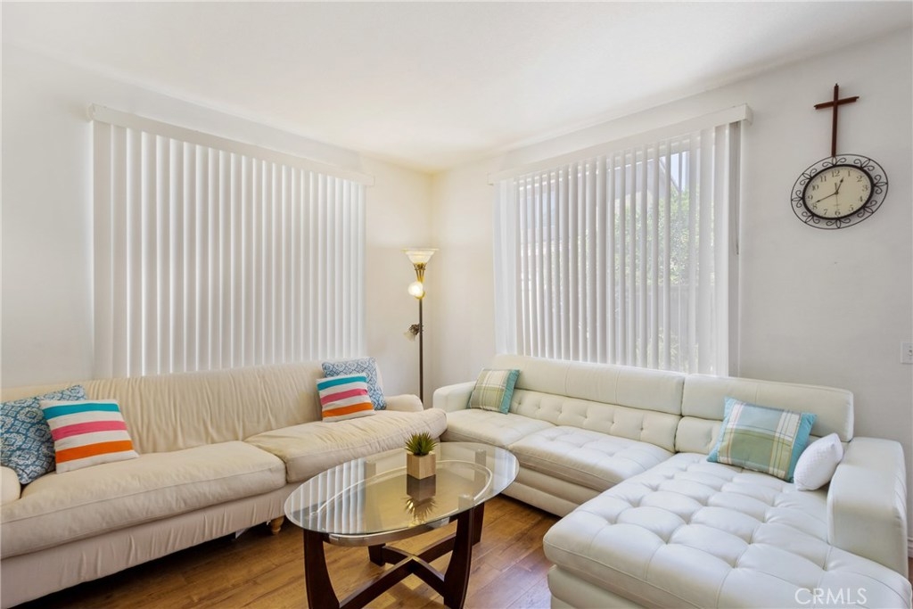 Welcome to College Park - a gated community located near multitude of shopping centers, Cypress College, and Knott's Berry Farm. This detached 4-bedroom condo has the most sought-after floorplan with one bedroom and bathroom downstairs. Kitchen opens to the dining area with a cozy fireplace. Living Room features beautiful wood floors and large light-catching windows. Upstairs, the Master Suite features French doors to the spacious balcony, and an en-suite bath with walk in closet and separate tub and shower. Secondary bedrooms are on opposite end of the hallway, and share the bathroom with dual sinks and tub. Convenient indoor laundry room is located upstairs. Attached two-car garage with plenty of room for storage, and long driveway for additional parking. For a low monthly HOA fee, residents can enjoy the sparkling pool & spa, playground, BBQ & picnic areas. One of the best neighborhoods in Buena Park!